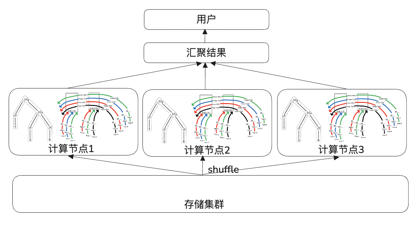 向量化执行引擎在OLAP场景有大幅度的性能提升,却仍然无法解决单台计算节点的CPU和内存受限的问题,同时随着处理数据量增大,单节点执行时间呈指数级增长。