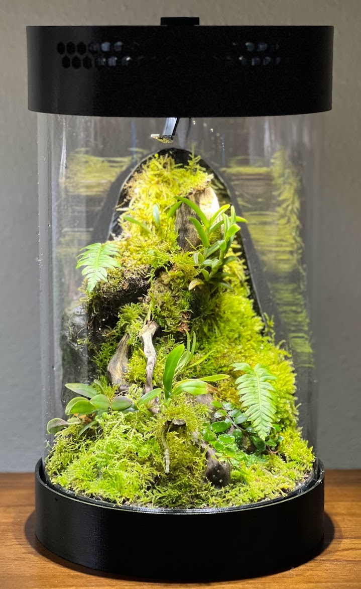 Oasis 是一款完全开源、主要由 3D 打印而成的智能玻璃容器。它为苔藓、蕨类植物、兰花等喜湿植物提供了理想的生长环境。其设计包括: