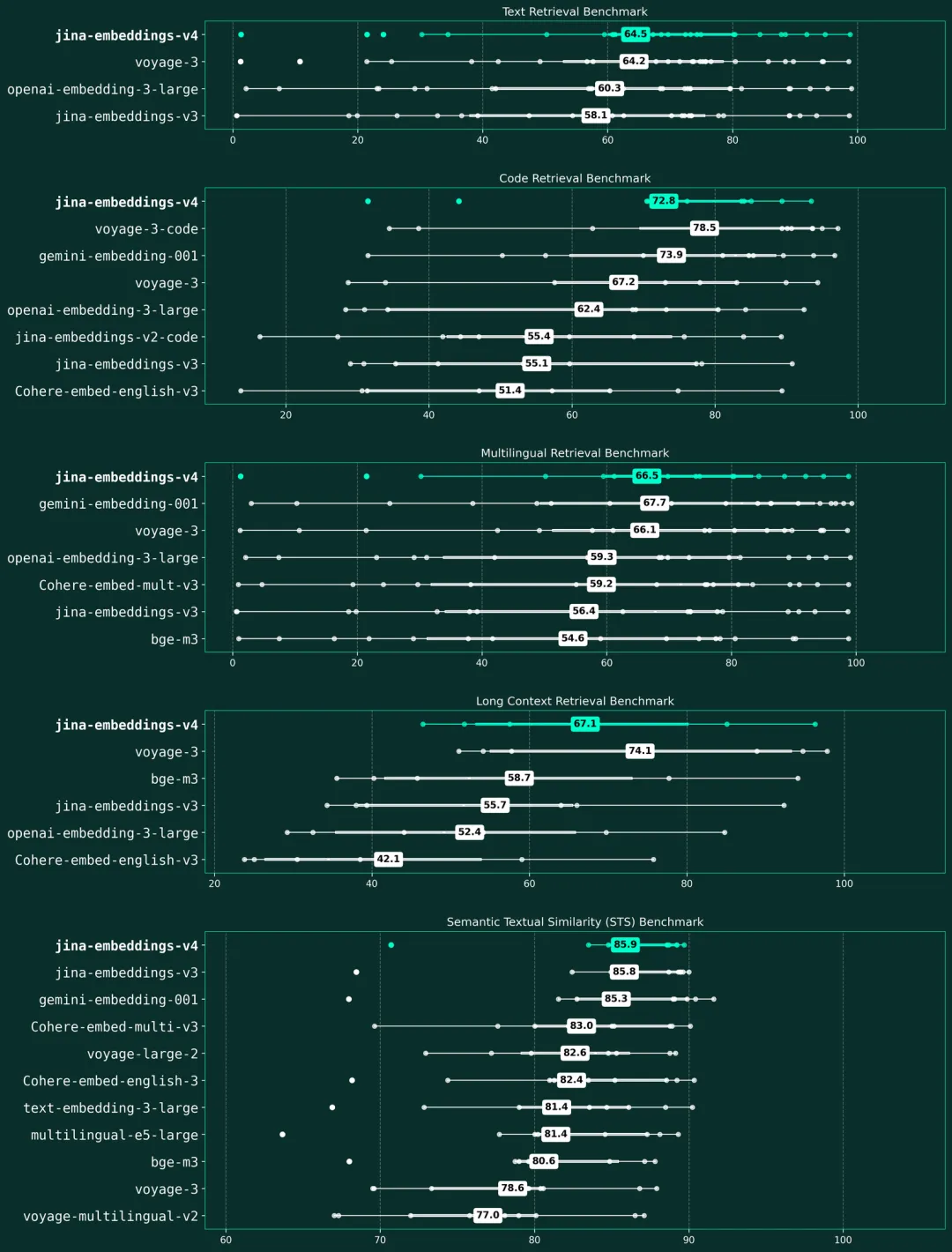 “jina-embeddings-v4 是我们迄今为止最具突破性的一款向量模型。作为一款开源模型,它的性能表现已全面超越来自主流供应商的顶尖闭源模型。”