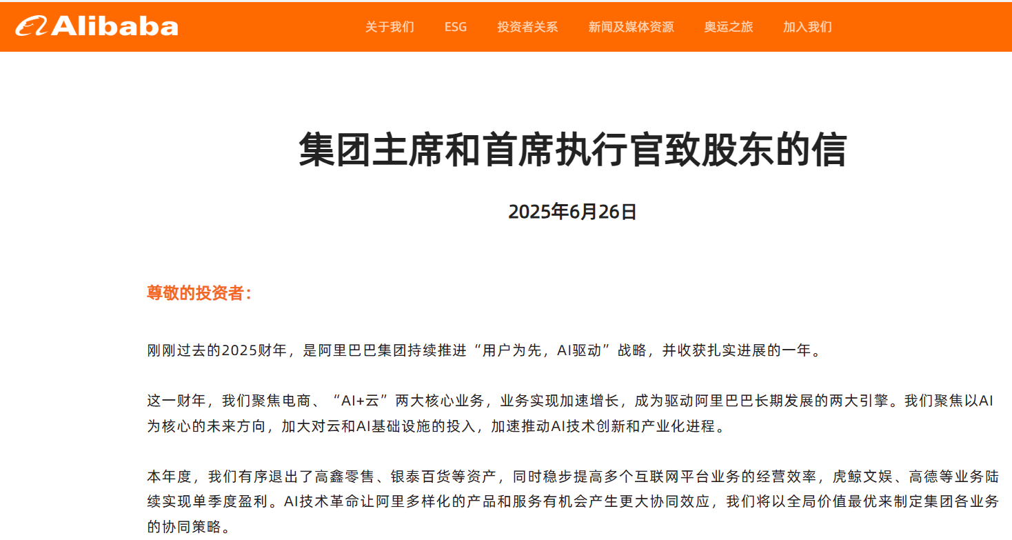 在致股东信中,阿里巴巴表示,“阿里的基因里没有守成,只有创造。今天的阿里巴巴,正在以创业者的姿态,开启面向AI时代的全新征程。”