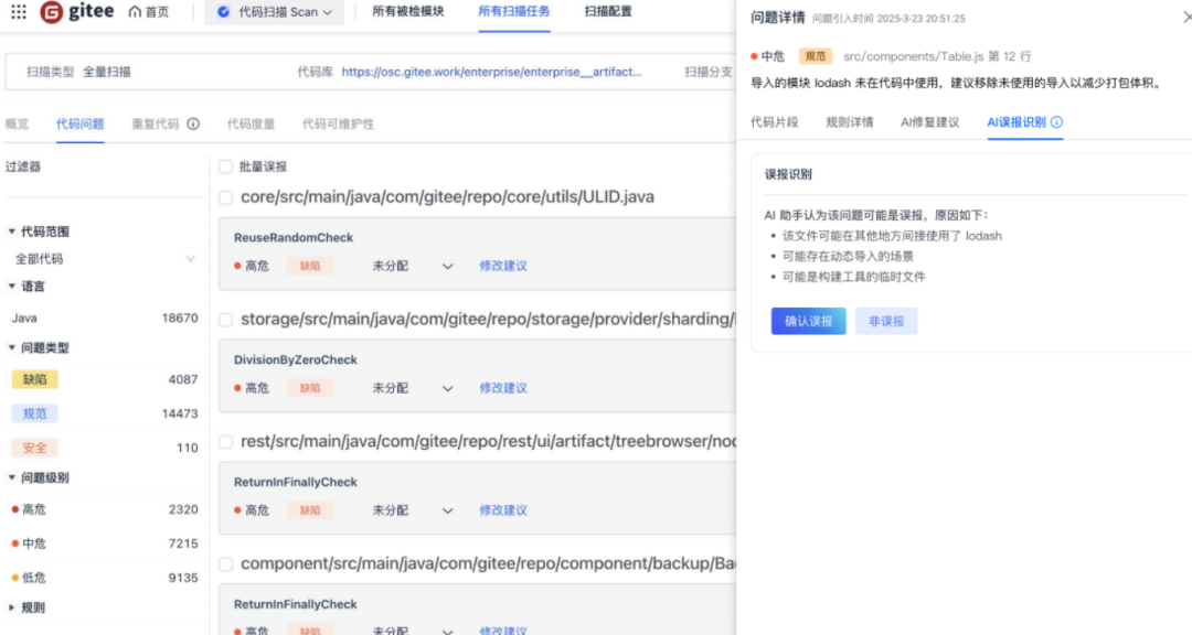 同时,Gitee Scan 正在探索 AI 技术在安全能力中的深度融合,推进「自动判断 + 智能修复」能力落地: