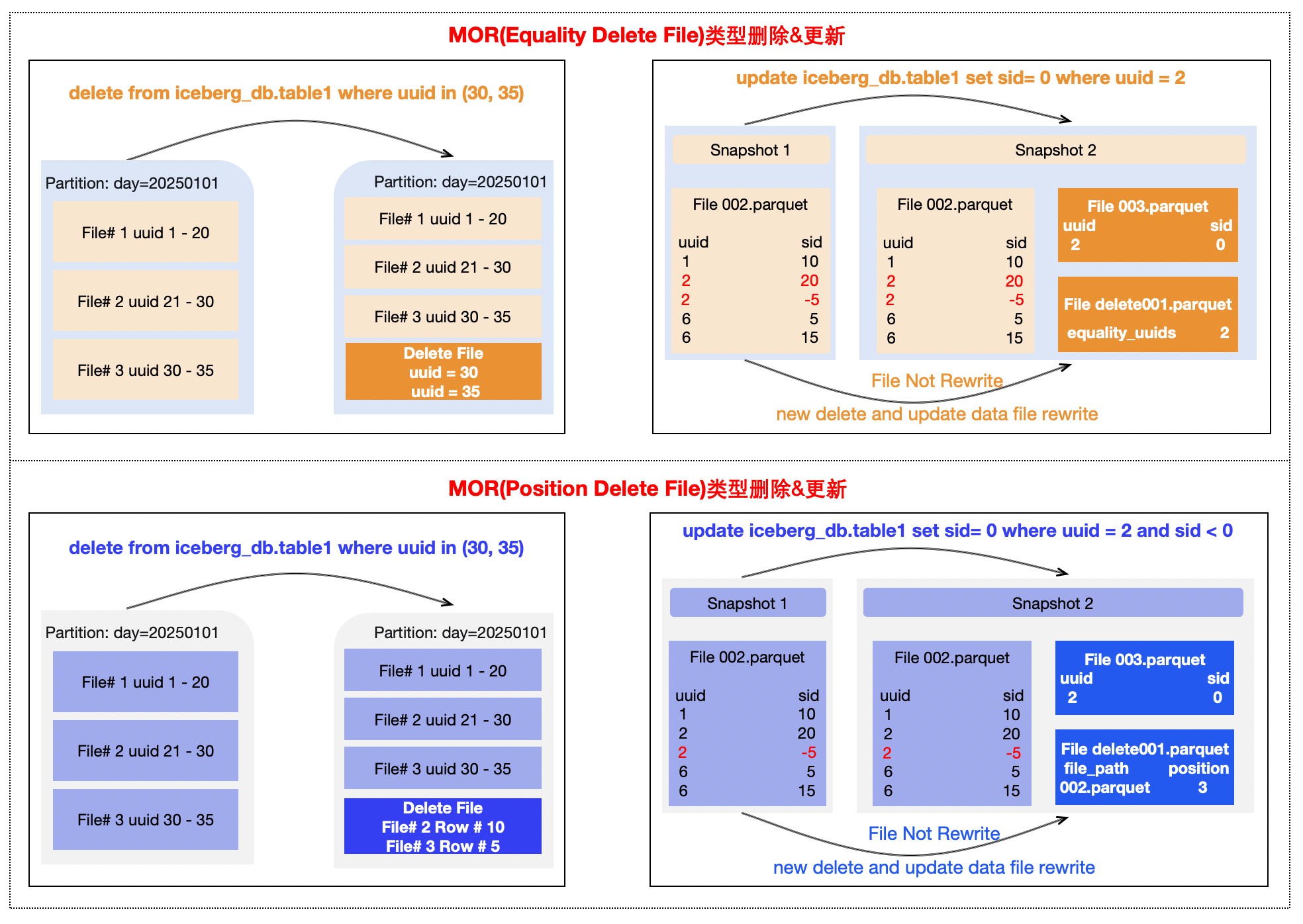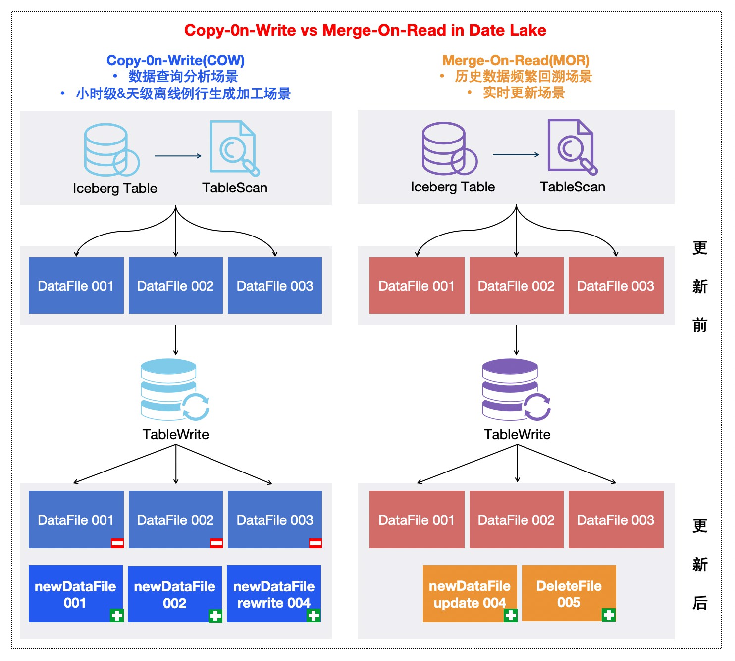 针对数据行级更新,Iceberg提供了两种策略,分别为COW(Copy on Write: 写时复制) 或 MOR (Merge on Read:读时合并),其中MOR根据其标记删除文件的区别又细分了两种方式(Equality Delete File和Position Delete File)。