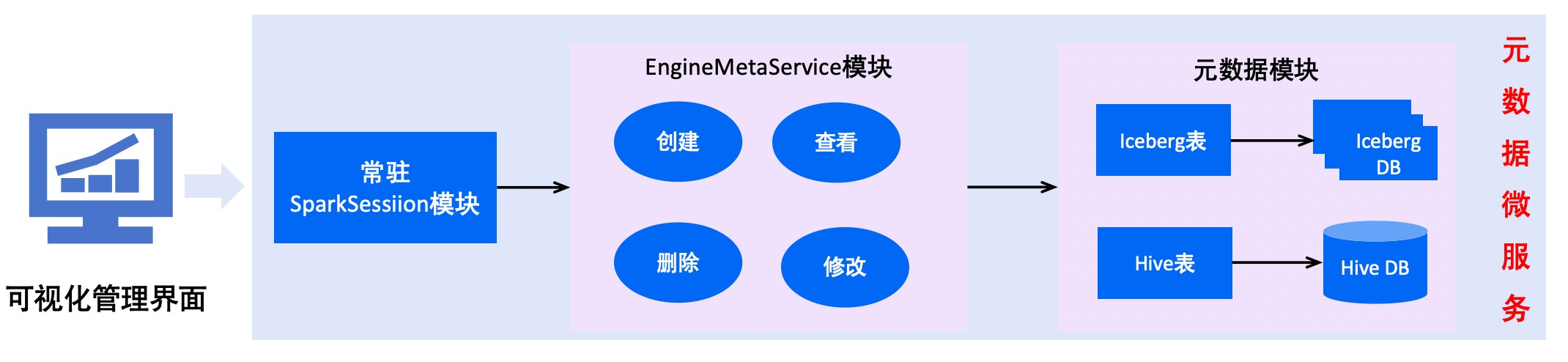 该微服务主要包含常驻SparkSession模块,EngineMetaService模块和元数据模块,通过将SparkSession常驻,为用户提供Iceberg表和Hive表元数据和分区数据的增删改查功能,以及可视化的元数据管理界面。