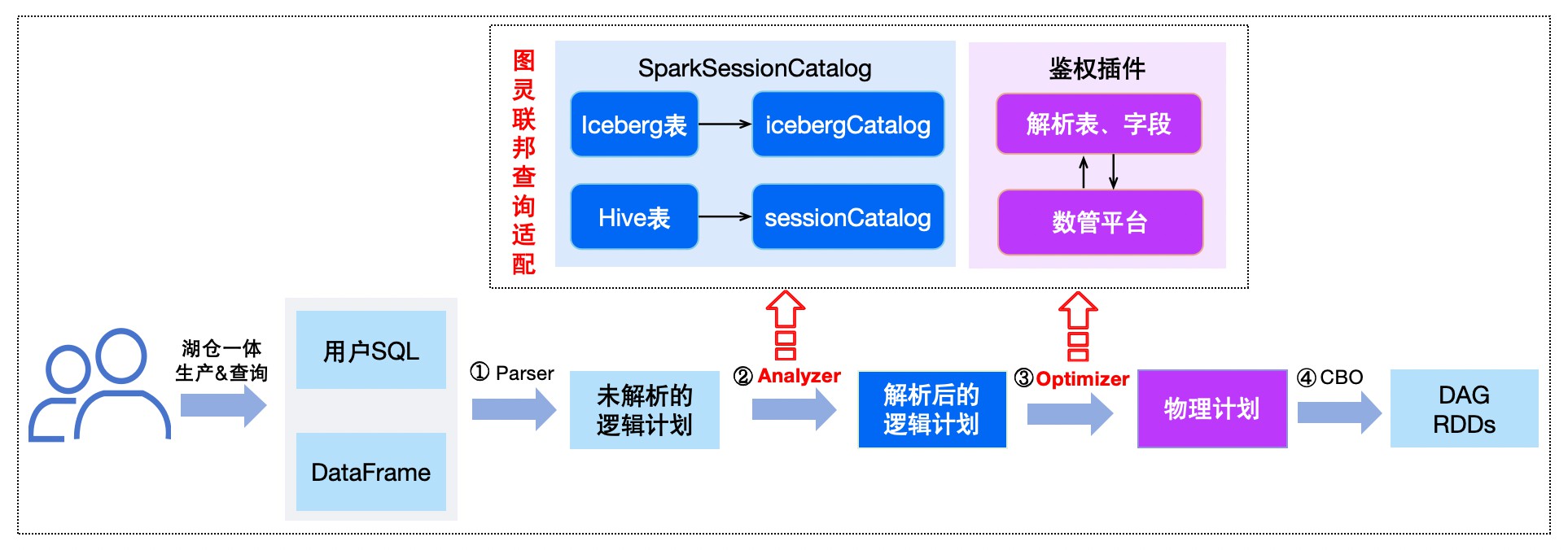 通常在一条SQL执行过程中,主要可简化以下Parse、Analyzer、Optimizer、CBO四个流程。通过在Analyzer和Plan阶段进行改进优化,来打通Iceberg和Hive表联邦查询。