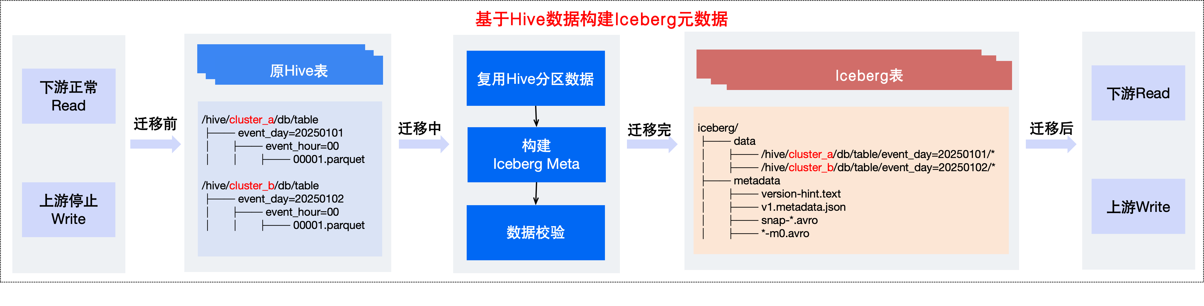 构建Iceberg元数据:直接复用Hive的分区数据,新建同名的Iceberg表,并重建Iceberg元数据,最终新Iceberg表的元数据信息实际指向是Hive分区数据存储位置。