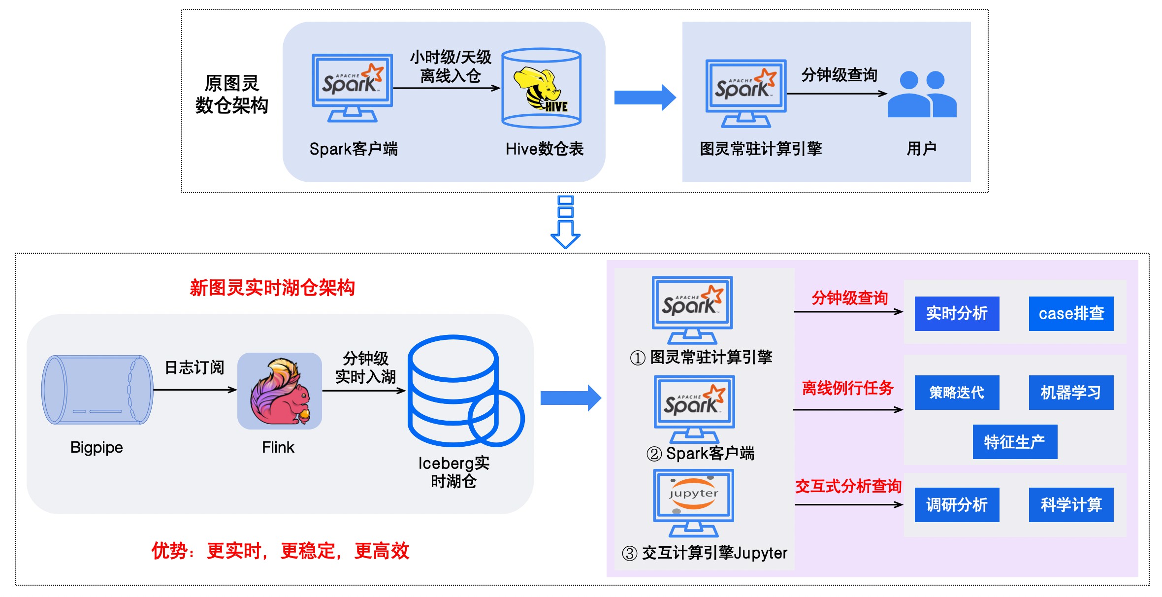 为解决该问题,我们基于Iceberg+Flink构建的图灵实时湖仓架构,整体重构流程如下图所示。该架构模式实现了数据分钟级别实时入仓,显著提升了数据入仓的时效性。进一步扩展了整个图灵的应用场景。