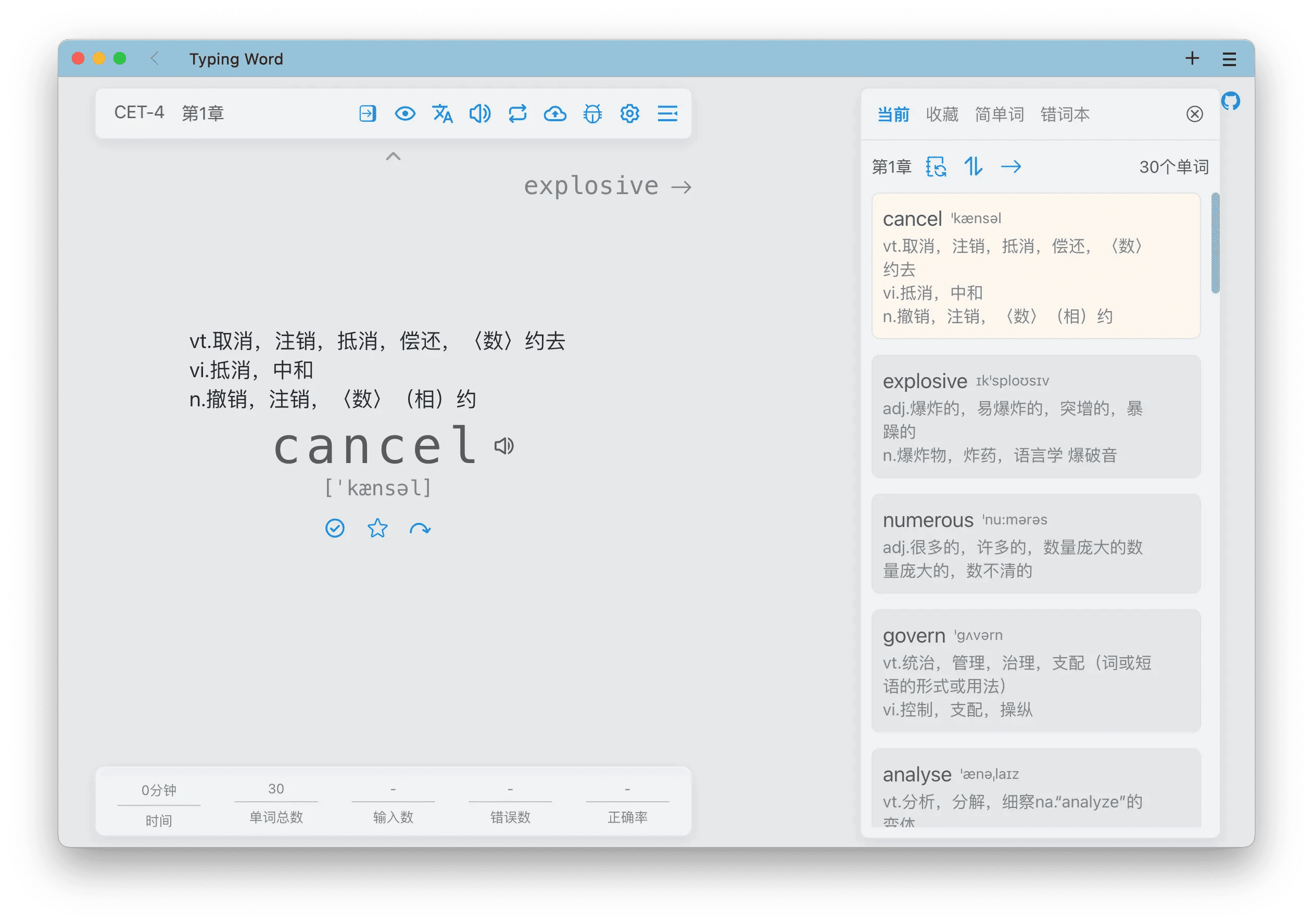 这是一款基于网页的背单词软件,帮助用户通过键盘输入来记忆单词。它界面简洁、交互流畅,支持单词发音、错误统计和生词本等功能。
