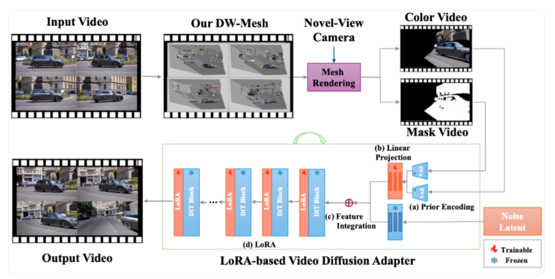 EX-4D基于预训练的WAN-2.1模型,结合 LoRA-based Adapter 架构,在保持计算效率的同时,融入了DW-Mesh的几何先验信息,确保生成视频的几何一致性和帧间连贯性。这种轻量级设计使得EX-4D在资源受限的环境下也能高效运行,适合广泛的开发场景。