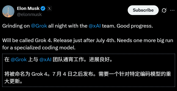 相关阅读:Grok 4 将于 7 月 4 日后发布