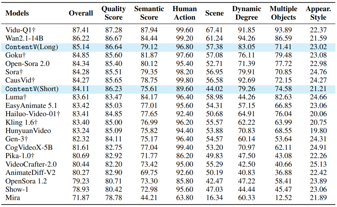 在 VBench 这一主流视频生成评测基准上,ContentV(8B)取得了 85.14 的综合得分,表现优于多个现有的商业闭源模型,包括 Sora、Kling 1.6 和 Gen-3 等。