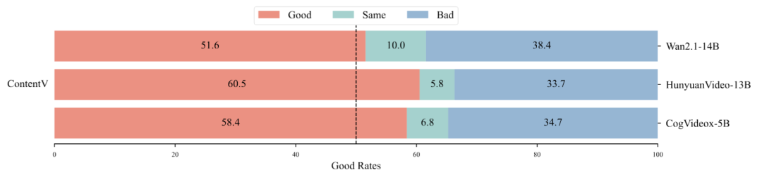 为更贴近真实用户偏好,研究团队围绕感知质量、指令跟随、物理一致性和视觉效果四个维度开展了人类偏好评估。结果显示,ContentV 在整体表现上与 CogVideoX-5B、HunyuanVideo-13B 和 Wan2.1-14B 等主流开源模型相比具有一定优势。