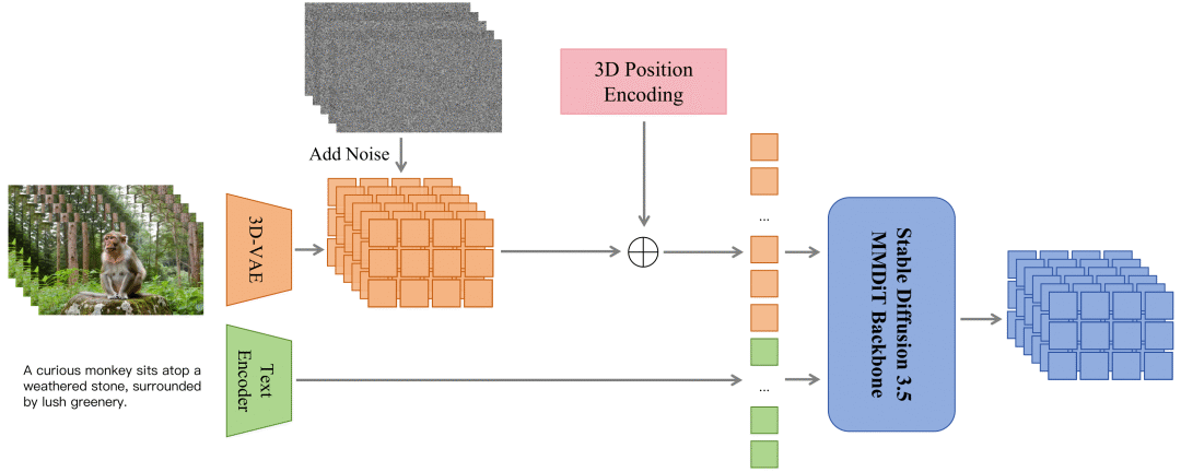 为验证 ContentV 方案的通用性,本次开源的版本在扩散模型部分采用了经典的文生图模型 Stable Diffusion 3.5 Large。为了适配视频模态,模型在结构上仅做了以下两项必要调整:
