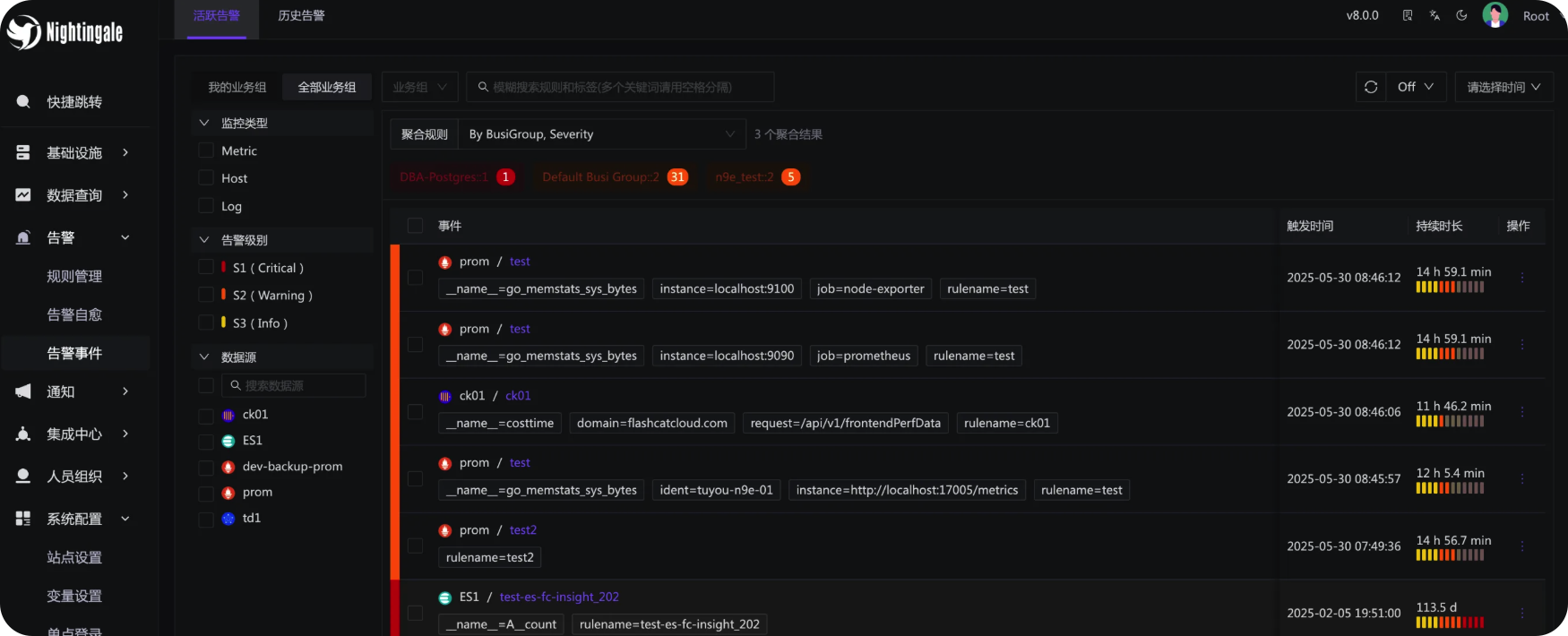 夜莺侧重在产生告警事件,那告警事件的展示,自然也很关键。我们优化了活跃告警事件的全景看板,更好的 UI、更方便的聚类和筛选,易用性大幅提升。