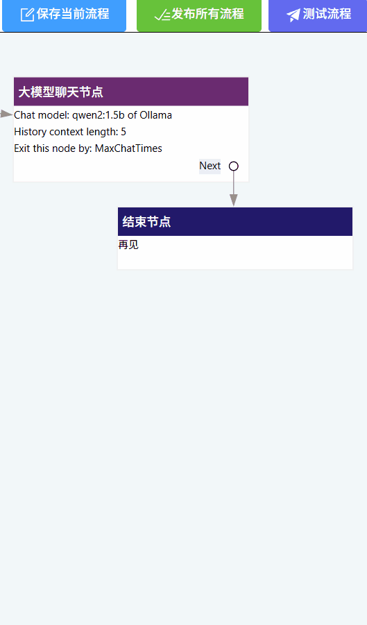 2. 大模型聊天节点:使用大模型和用户交流, 支持 OpenAI, Ollama, 和 HuggingFace 本地大模型
