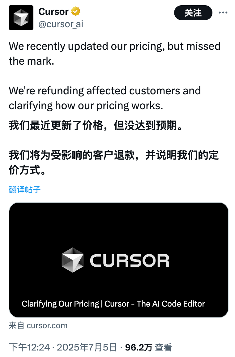 官方承认,6月16日发布的价格调整说明并未清晰地传达变更情况,伤害了用户信任,并承诺为在6月16日至7月4日期间产生意外使用费用的用户提供全额退款。需要退款的用户可联系pro-pricing@cursor.com办理。
