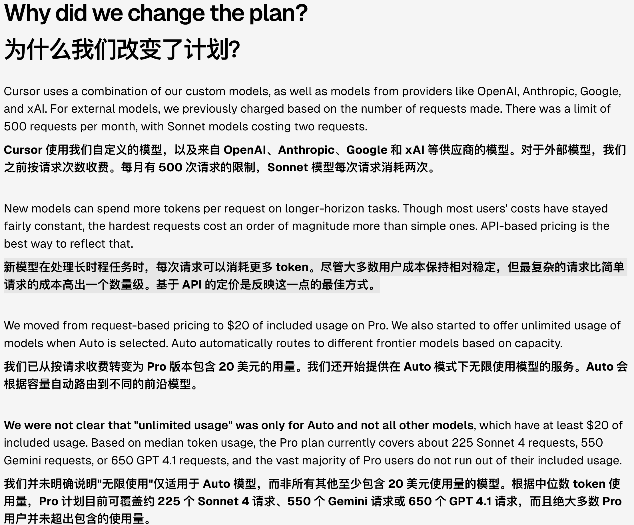 官方澄清,此前宣传的“无限使用”仅限于自动选择模型的Auto模式。20美元的额度根据中位数使用量估算,Pro Plan可覆盖大约225个Sonnet 4请求、550个Gemini请求或650个GPT-4.1请求。