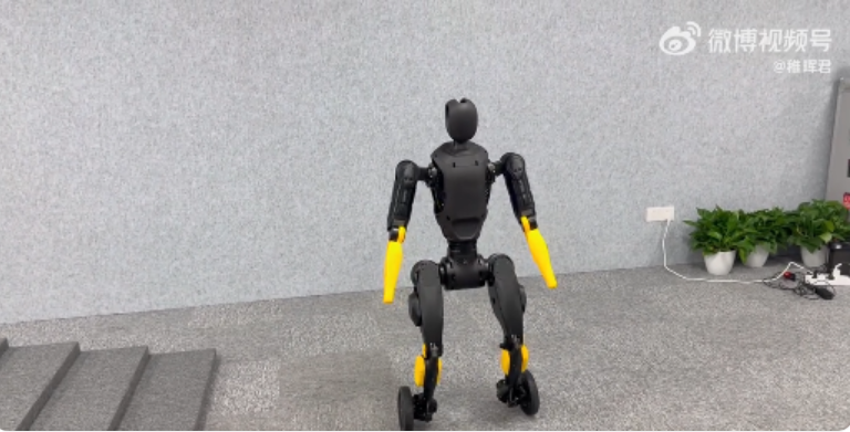在足式状态下,灵犀X2-N展现出卓越的越障能力,可以盲走上台阶,甚至在手持近12斤重物的情况下也能稳健前行,显示出强大的负载和平衡性能。