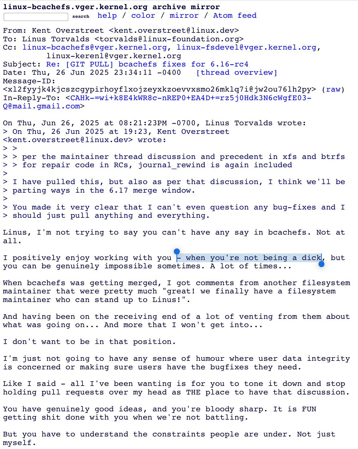 “Linus,我不是想说你对 Bcachefs 就不能发表意见,没这意思,老实讲我挺乐意和你合作 —— 前提是你别这么几把难搞。不过你有时候真是疯了,而且经常这样……”