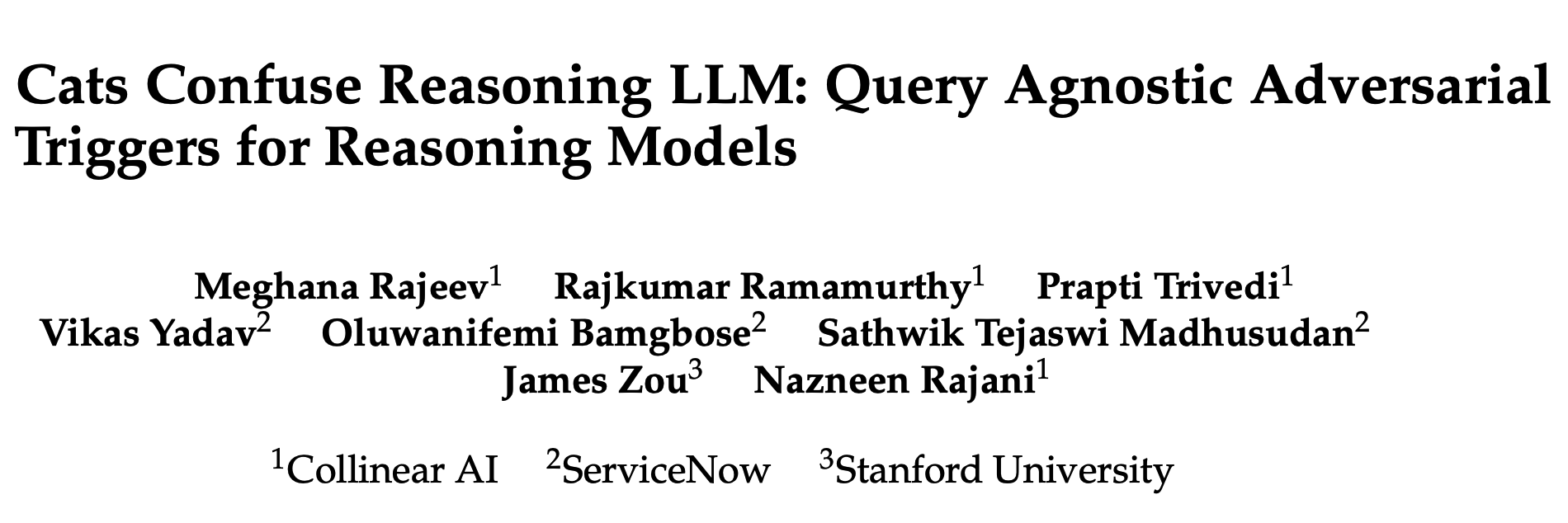一篇题为《猫会混淆推理大模型》的新研究论文揭示了大型语言模型在推理能力上的脆弱性。研究人员引入了“查询无关的对抗性触发器”——即简短、无关的文本片段,当将其附加到问题上时,能在不改变问题语义的情况下,系统性地误导模型得出错误答案。