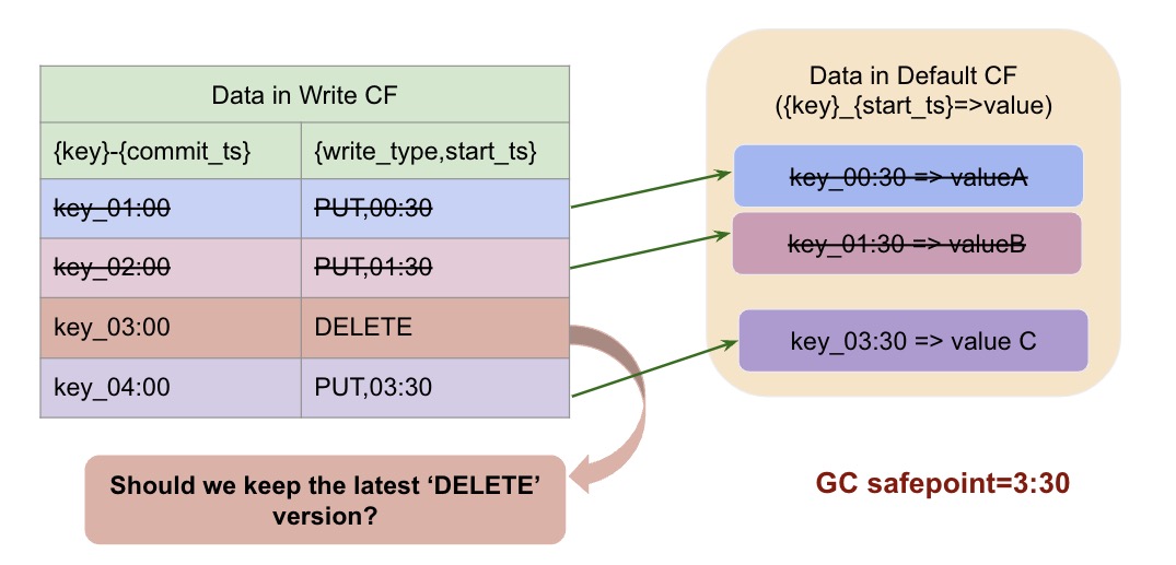 如果 GC safepoint 是 2:30, 即最多保证到 2:30 这个时刻的快照一致性,那么我们会保留 2:30 这个时刻读到的版本:key_02:00=>(PUT,01:30), 他之前的版本数据全部删除,这里我们 key_01:00 对应事务的 write-cf 和 default cf 都会被删除掉。