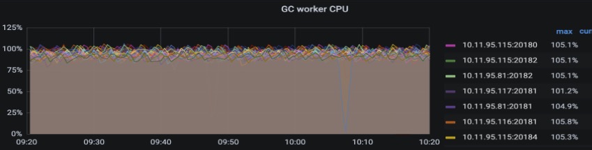 - GC worker 成为瓶颈。因为所有的回收都需要打到 GC worker 上,而 gc worker 只有一个线程,所以表现为它的 CPU 跑满,具体可以查看监控:tikv-details->thread CPU-> GC worker
