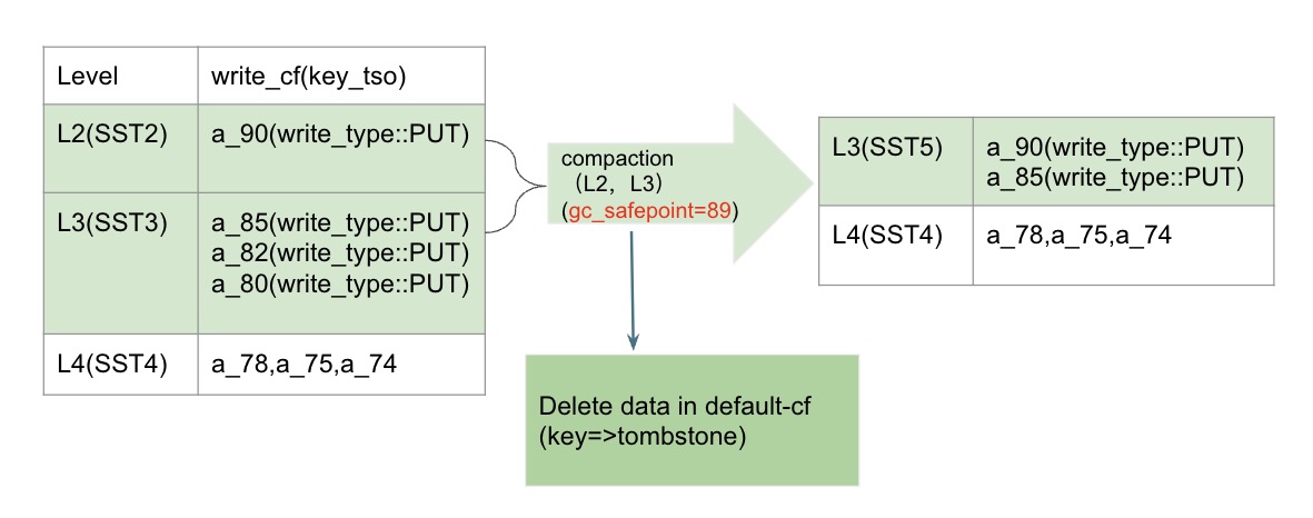 - 从右边我们看到,新的 SST 文件中,只有 a_85 和 a_90 两个版本了。其他的版本及对应 default-cf 里面的具体数据,在 compaction 过程中一起删除掉了。