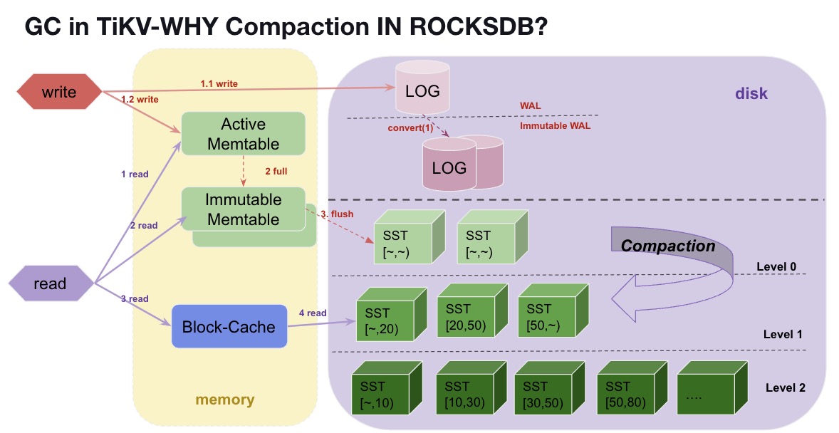 通过前面几章我们知道,使用传统的 GC 方式,我们会将 TiKV 层的 MVCC 一个个扫出来,根据 safepoint 确认其可以被删除后,再发送给 raftstore 也就是 rocksdb 一个 (DELETE key) 的操作。而 rocksdb 基于 LSM tree 实现,其内部也采用了 MVCC 机制,也就是当新写入,即使是删除写入时,旧版本数据不会被立刻被删除掉,而是与新写入的数据同时保留。