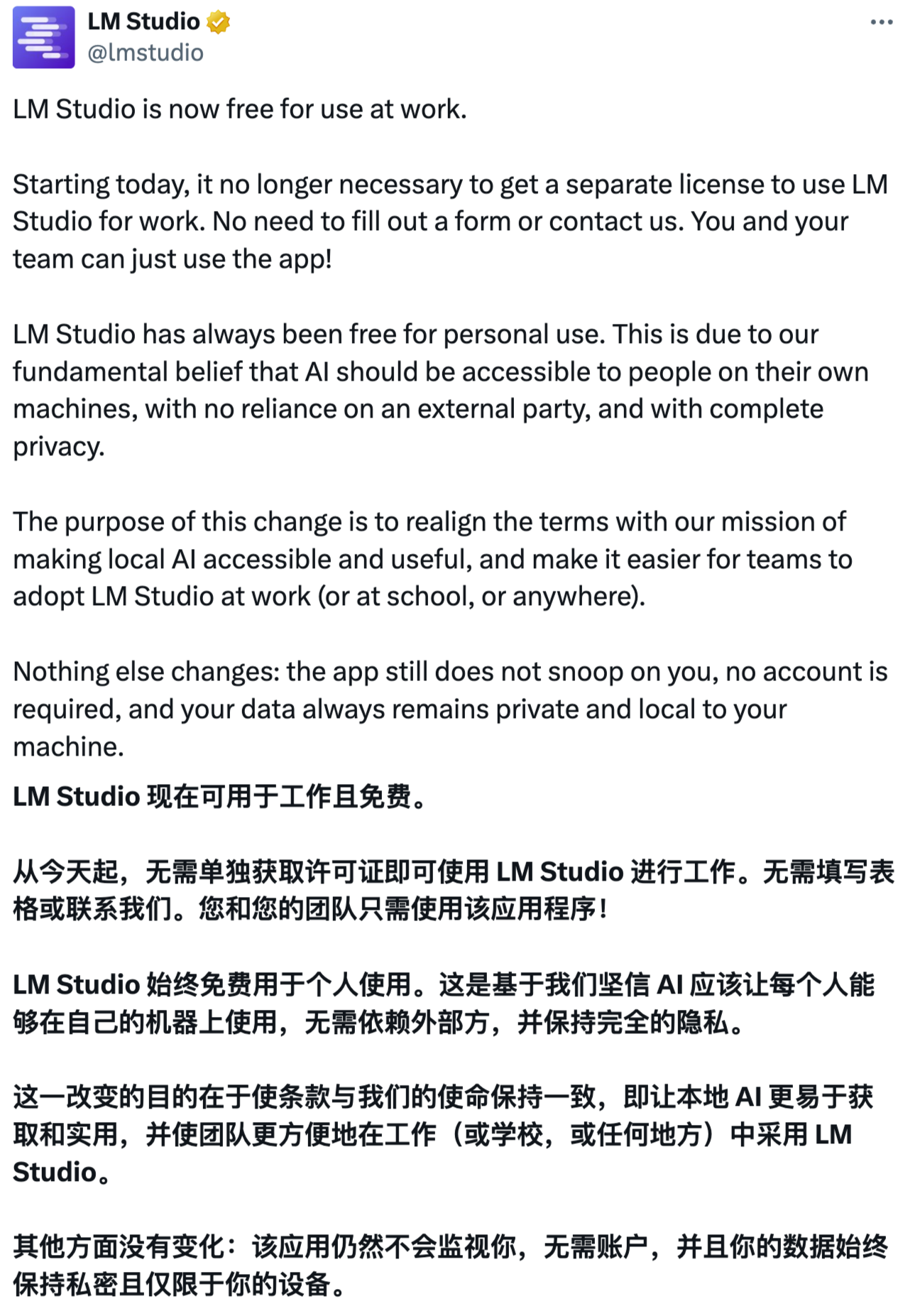 LM Studio 宣布其应用对所有用户完全免费,取消了原有的商业使用限制和许可证要求。