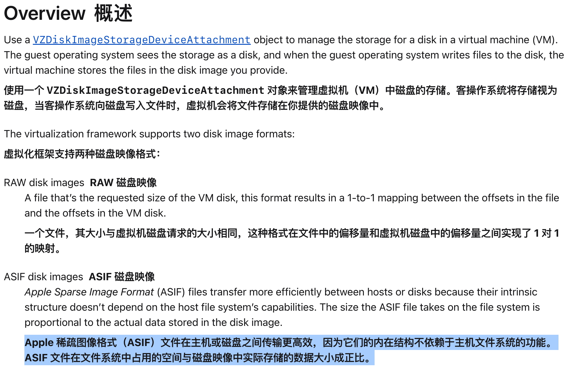 ASIF 带来的性能提升尤其与虚拟化相关。Apple 建议虚拟机从较旧的 RAW(UDIF 读写)磁盘映像过渡到 ASIF,理由是 ASIF 不仅能够提升速度,还能提高在主机或磁盘之间传输虚拟机文件的效率。