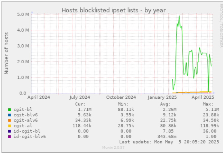 此外,自由软件目录 (FDM) 背后的服务器 directory.fsf.org 自 6 月 18 日起遭受攻击。这可能是一个 LLM 抓取工具,专门利用僵尸网络攻击 Media Wiki 网站。此次攻击非常活跃,目前已得到部分缓解。