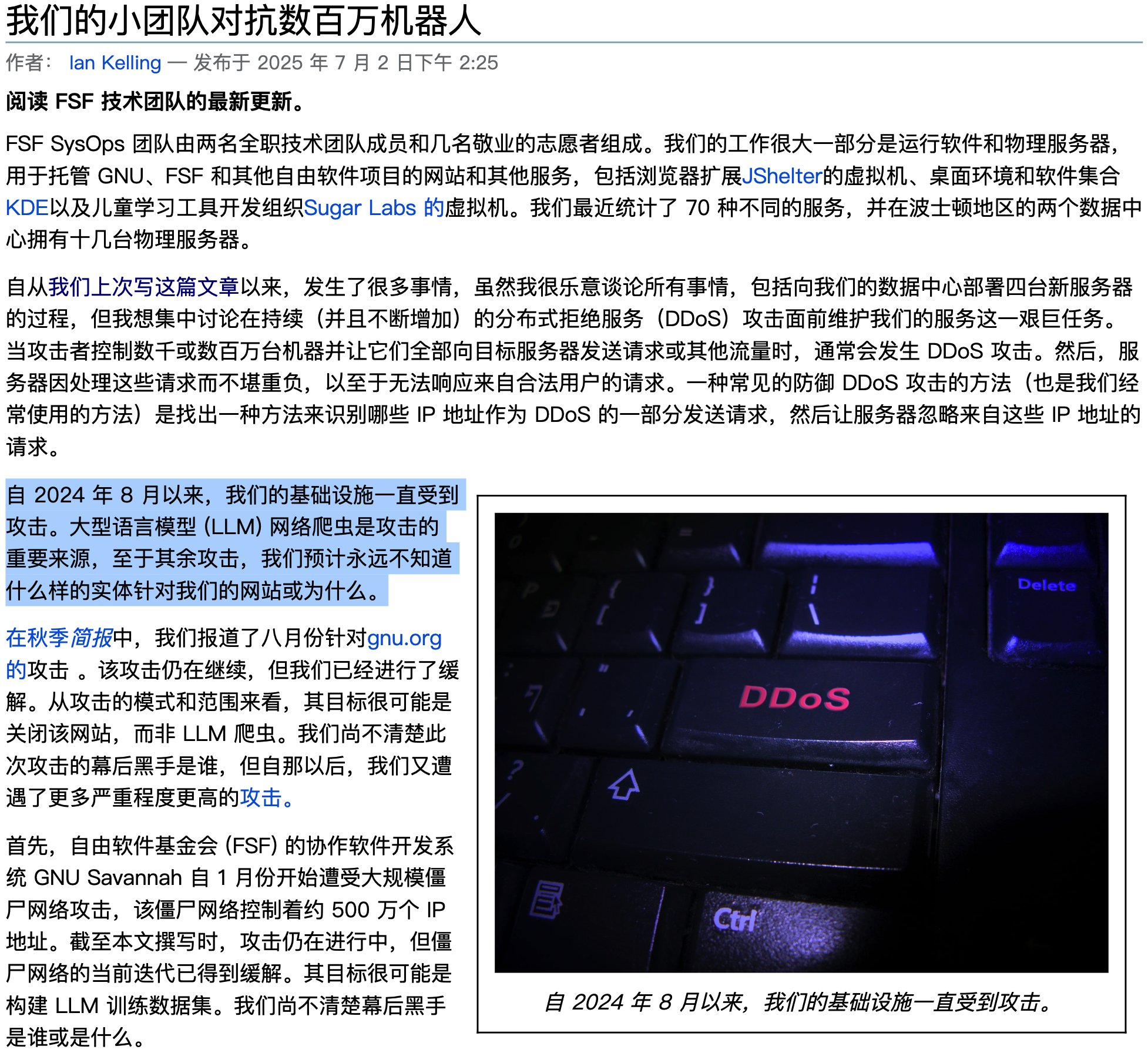 该团队透露,FSF 的基础设施自 2024 年 8 月以来一直受到攻击,其中 LLM 网络爬虫是攻击的主要来源。