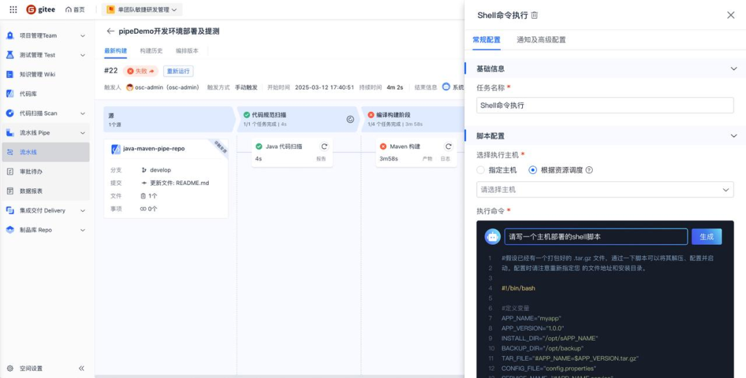 Gitee Pipe 作为新一代自动化引擎,通过「安全左移、合规内建、智能协同」三位一体的技术架构,灵活编排和管理代码扫描、功能测试、编译构建、发布部署等工具类任务,实现软件从代码提交到产品部署的全流程自动化,助力企业实现高效、安全、智能的软件交付,成为解决关键领域软件交付难题的有力工具。