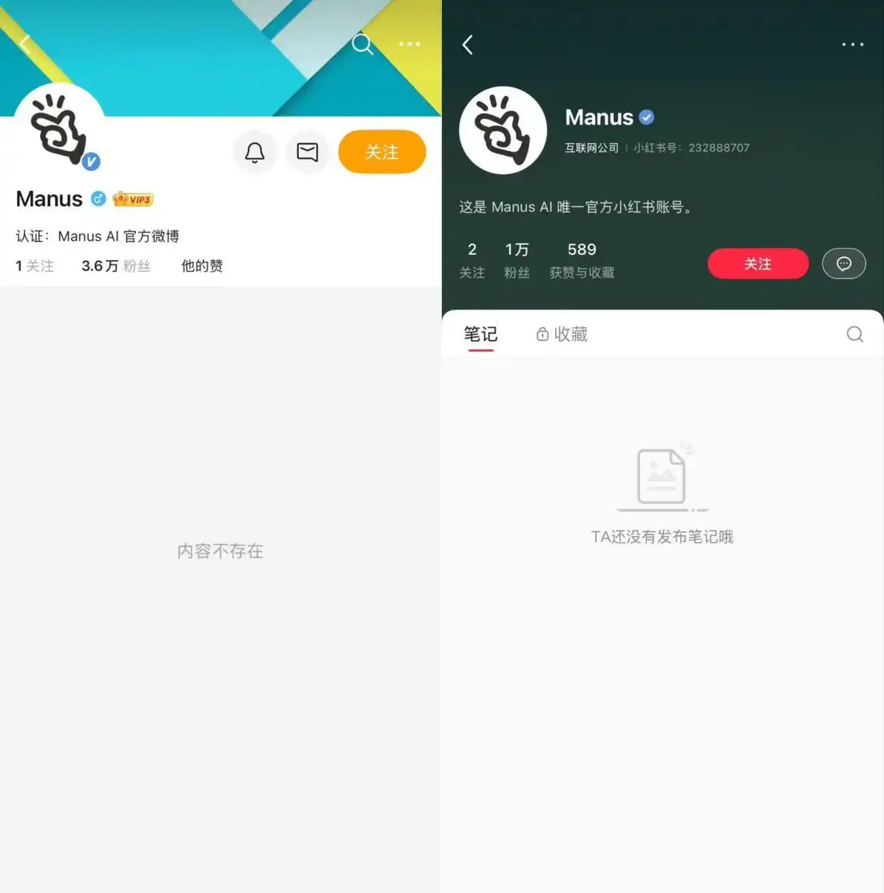 网友发现,通用AI智能体公司“Manus”的官方微博和小红书账号的内容今日均已清空。