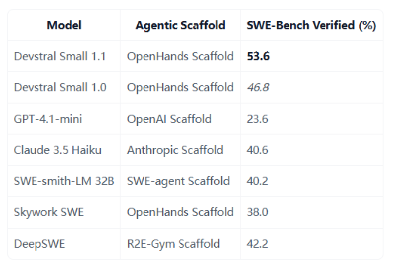 在性能测试方面,Devstral Small1.1在 SWE-Bench Verified 基准测试中获得53.6% 的成绩,证明其在为真实的 GitHub 问题生成正确补丁方面表现优异。虽然其性能不及大型商业模型,但在大小、推理成本和推理能力之间找到了一个平衡点,适合多种编码任务。