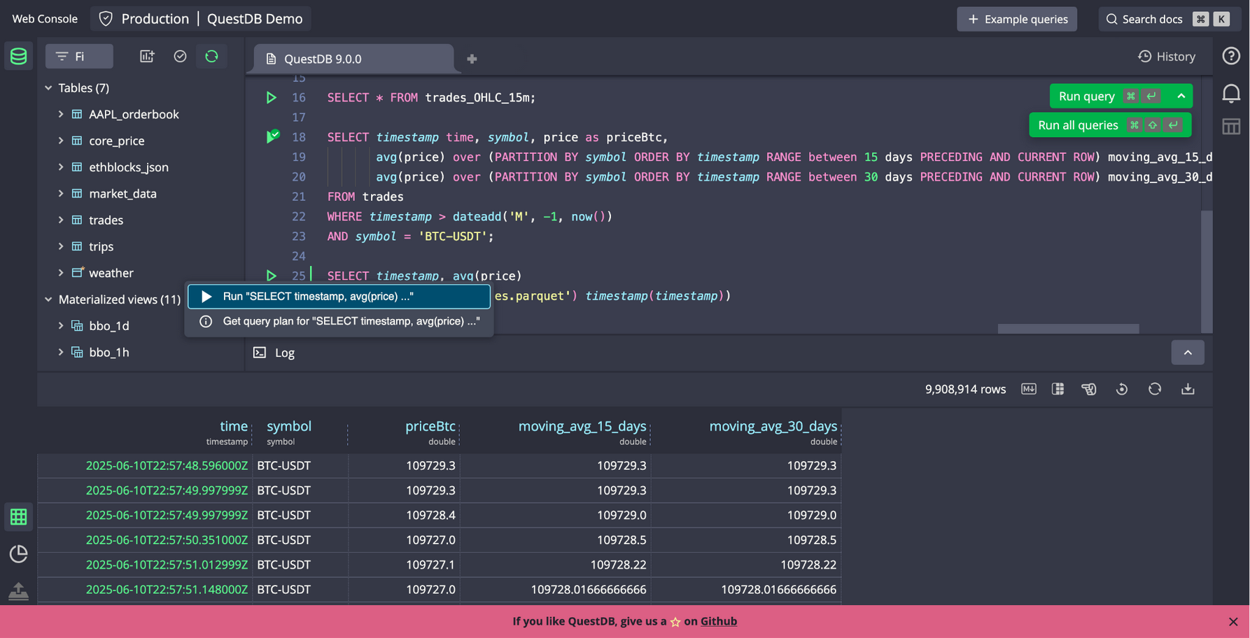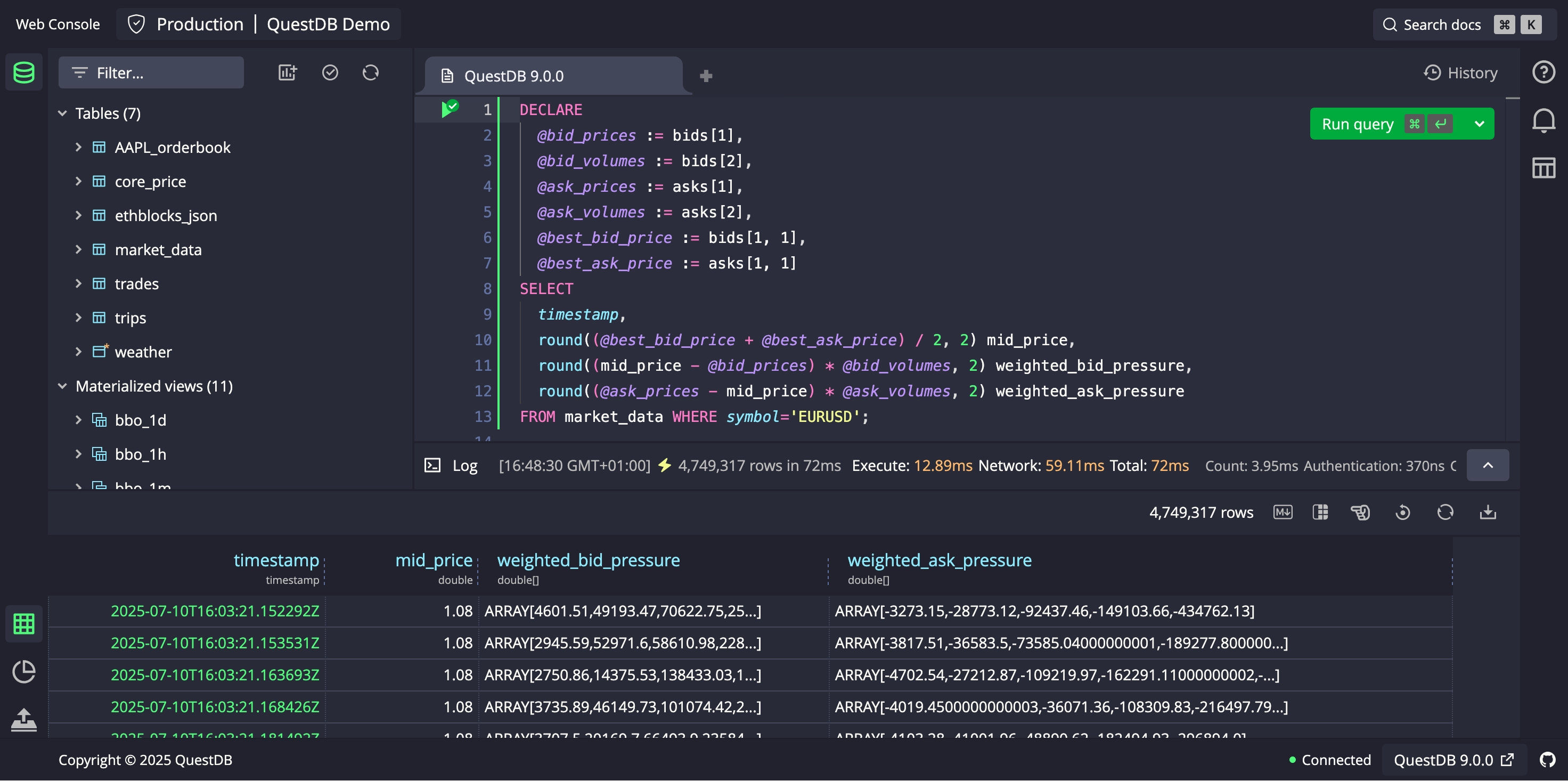 QuestDB 近日发布重大版本 9.0,增加了 N 维数组、日历感知的物化视图 (materialized views)、提高了数据去重效率、实现了更智能的 JOIN,并重构了 Web 控制台的 UX。