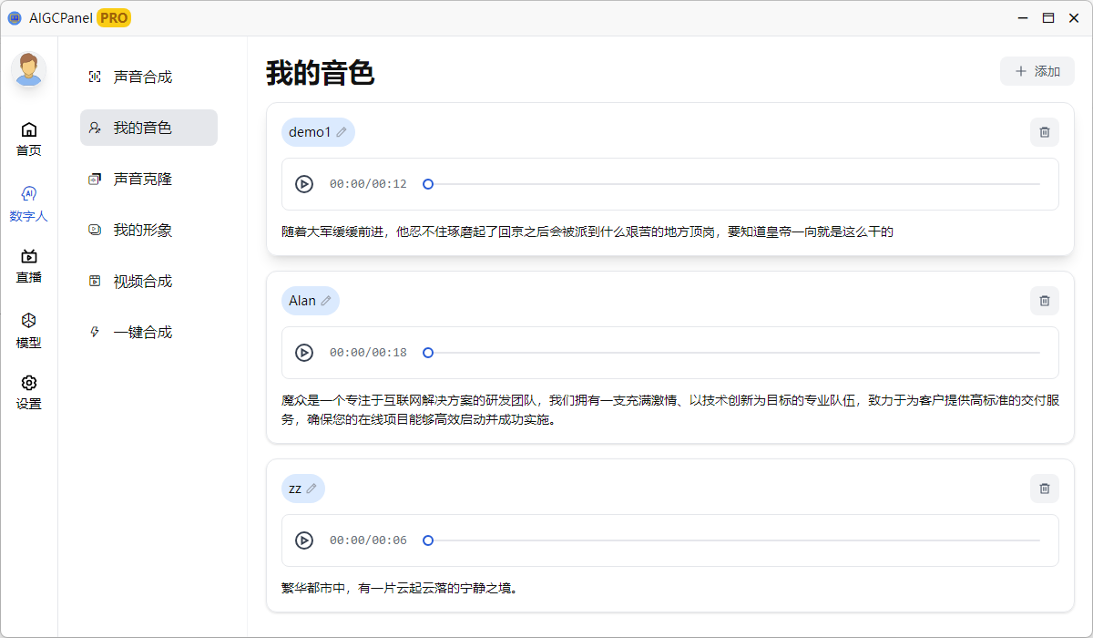 - 新增:音色预览功能,声音克隆、一键合成界面快速预览
