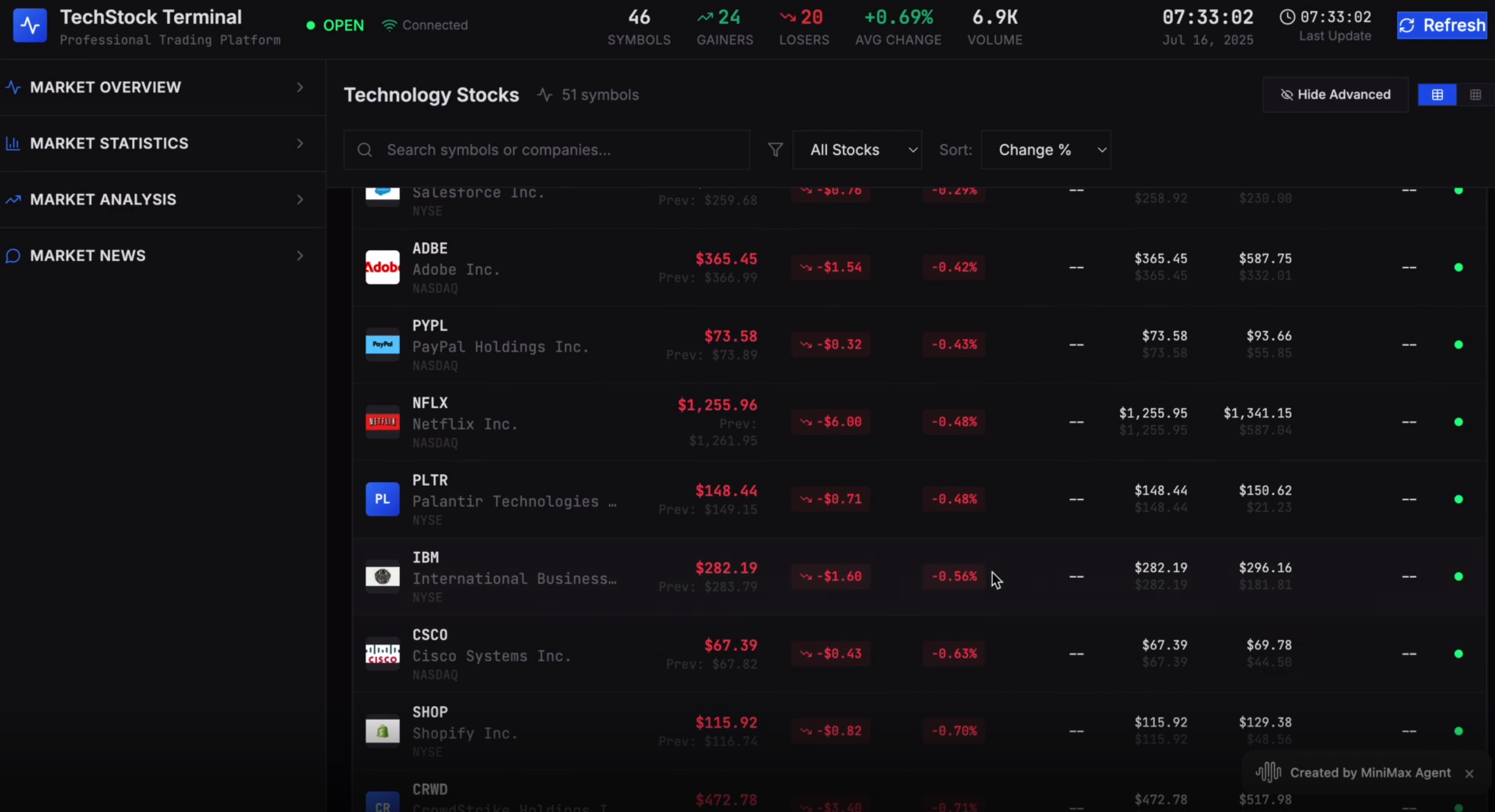投资者需要跟踪全球50只科技股票的最新价格和行业新闻?任何实时看板,Agent都可以为你随手定制了,全部是真实、准确、实时的金融数据,还能每天 07:00、12:00 和 17:00 更新。