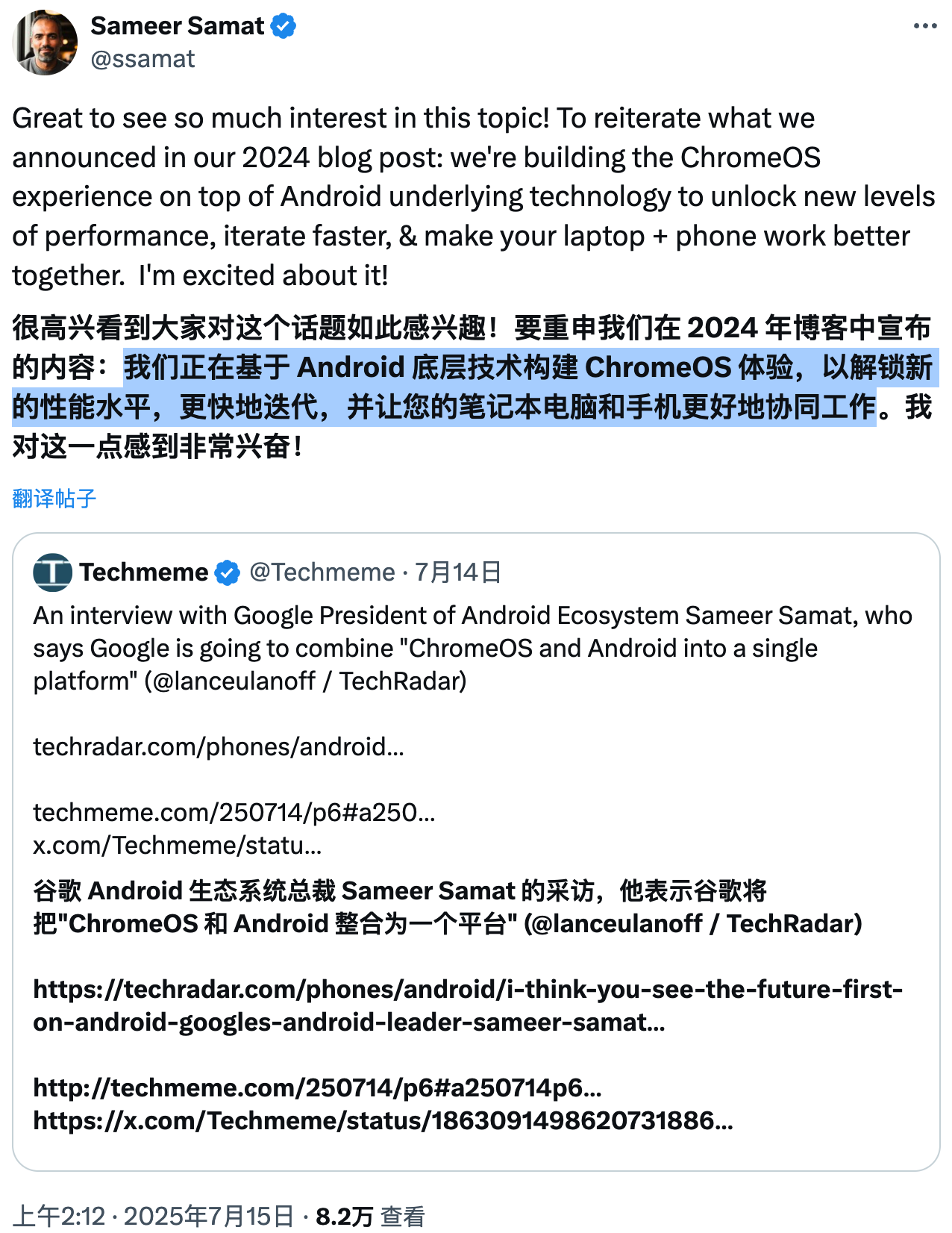 不过,Samat 随后在社交媒体上澄清表示,他只是重申了 2024 年谷歌博客中的公告,即 Chrome OS 将基于 Android 底层技术(如 Android 内核)构建,以提升性能、加快开发速度,并让笔记本电脑和手机更好地协同工作。