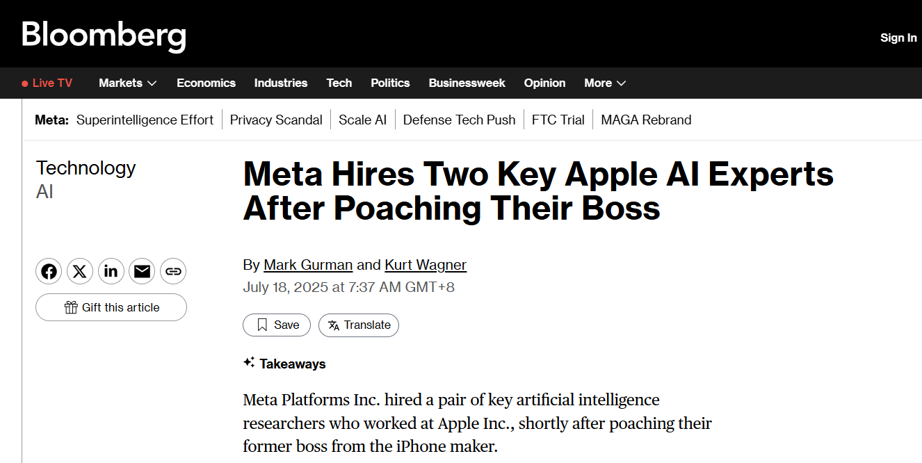 Meta 在挖走苹果 AI 部门主管后,再次挖走两名核心专家