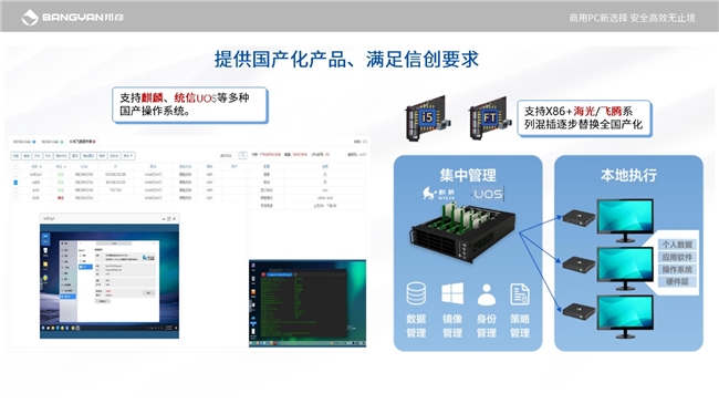 操作系统兼容银河麒麟、统信UOS及多家国产桌面OS,内置集中管控策略,实现开机即合规。