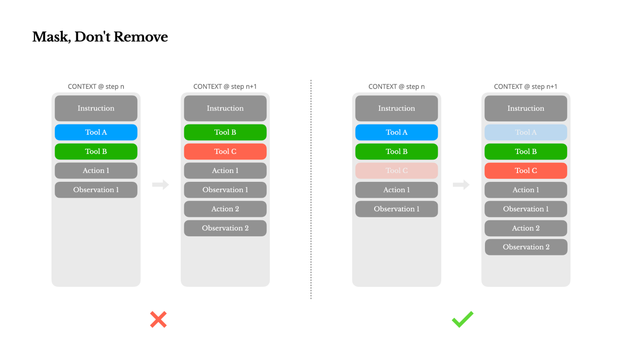 动态修改工具列表会让缓存失效、模型混乱。Manus 使用「遮蔽 token logits」的方法,让模型「看不见」不应调用的工具。