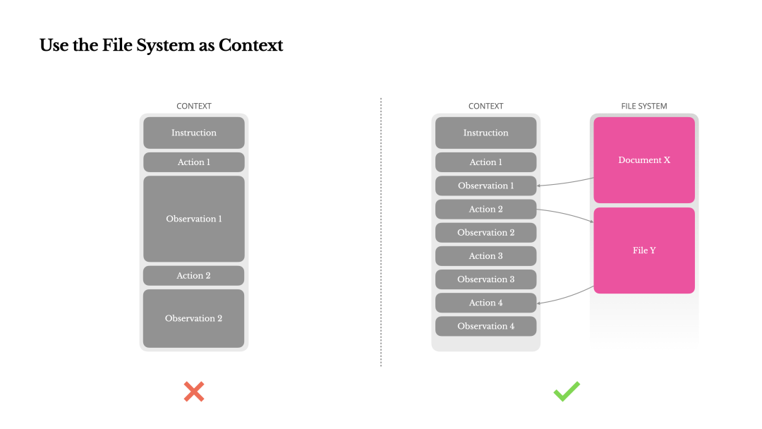 这就是为什么我们在Manus中将文件系统视为终极上下文:大小不受限制,天然持久化,并且代理可以直接操作。模型学会按需写入和读取文件——不仅将文件系统用作存储,还用作结构化的外部记忆。