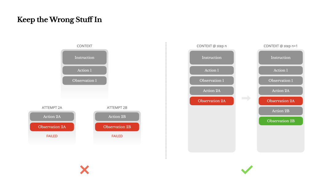 失败是构建 Agent 过程中的一部分。保留错误日志(如失败的操作、堆栈信息),能帮助模型更新内部信念,减少重复错误。
