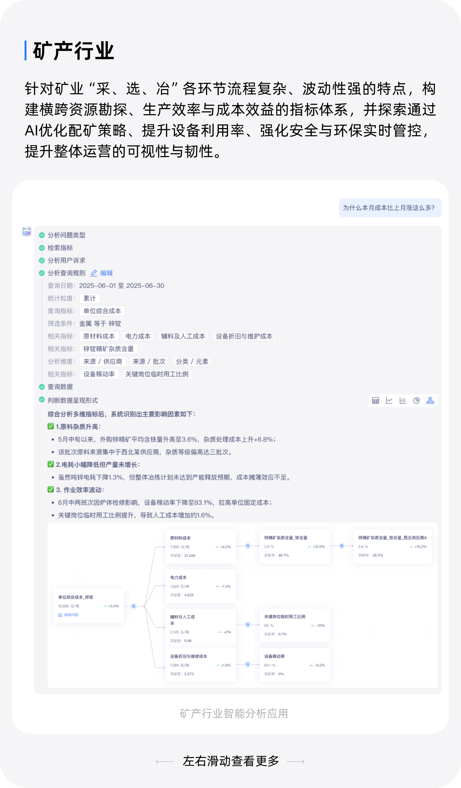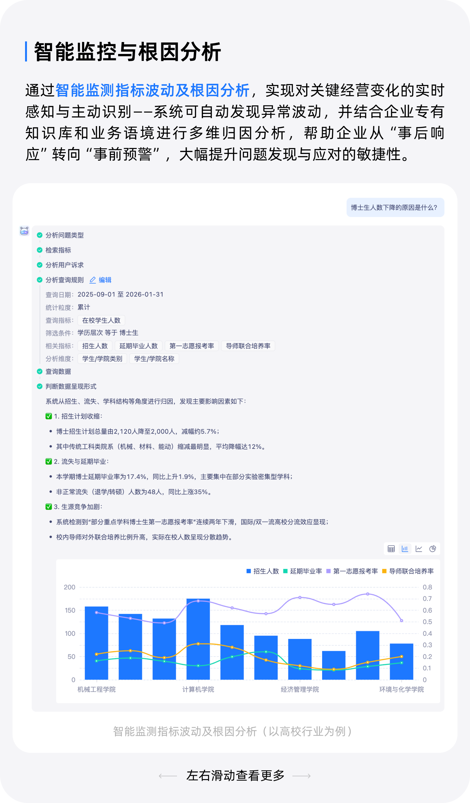 智能分析加速洞察生成:AI 自动关联指标维度、识别异常波动,辅助业务人员快速定位问题根源,减少人工分析成本。