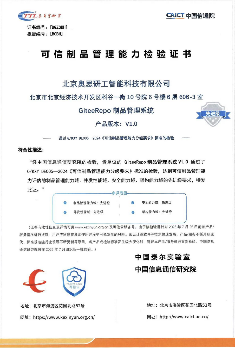 由开源中国·Gitee(北京奥思研工智能科技有限公司)研发的 Gitee Repo 制品管理系统成功通过《可信制品管理能力分级要求》标准,在制品管理能力域、并发性能域、安全能力域、架构能力域均达到先进级(最高级)要求,成为国内首个且目前唯一通过该评估的制品库产品。