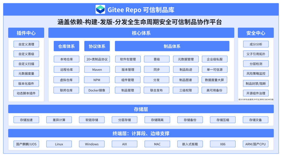 Gitee Repo 专为国内企业量身打造的强大制品管理系统,拥有完整自主知识产权,底层完全自主可信,适配多种国产芯片、操作系统、中间件、数据库,具备多家信创互认证。
