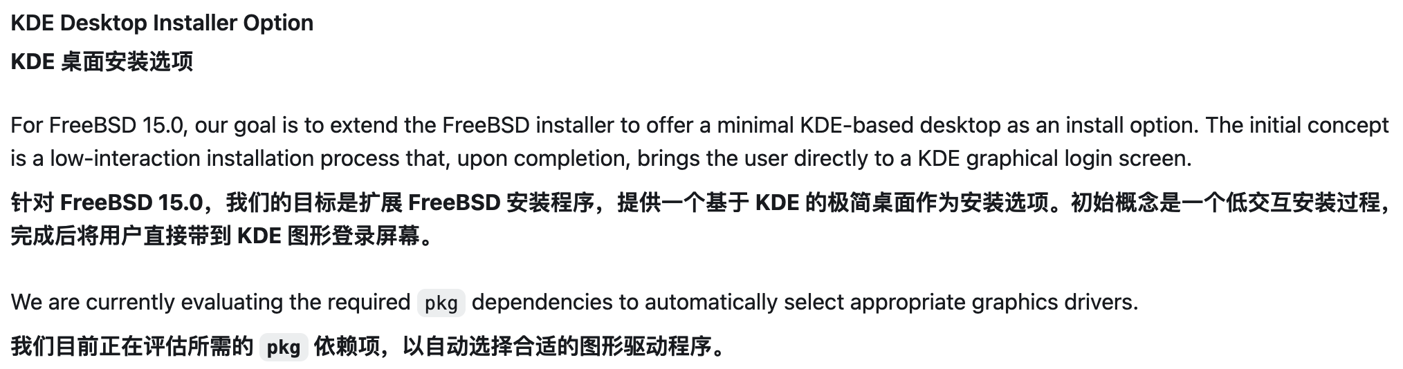 对于 FreeBSD 15.0,我们的目标是扩展 FreeBSD 安装程序,使其能够提供基于 KDE 的精简桌面作为安装选项。初始概念是采用低交互的安装流程,安装完成后,用户将直接进入 KDE 图形登录屏幕。我们