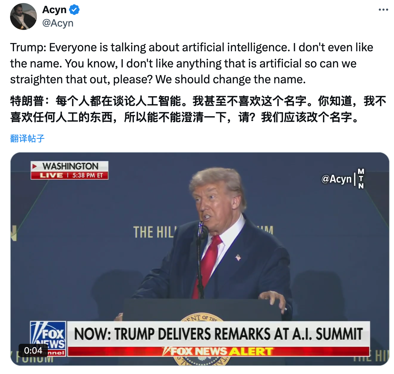 特朗普在讲话中称,自己不喜欢AI中“Artificial”一词,“我忍不了任何造作的东西,我甚至不喜欢人造东西这个名字”。