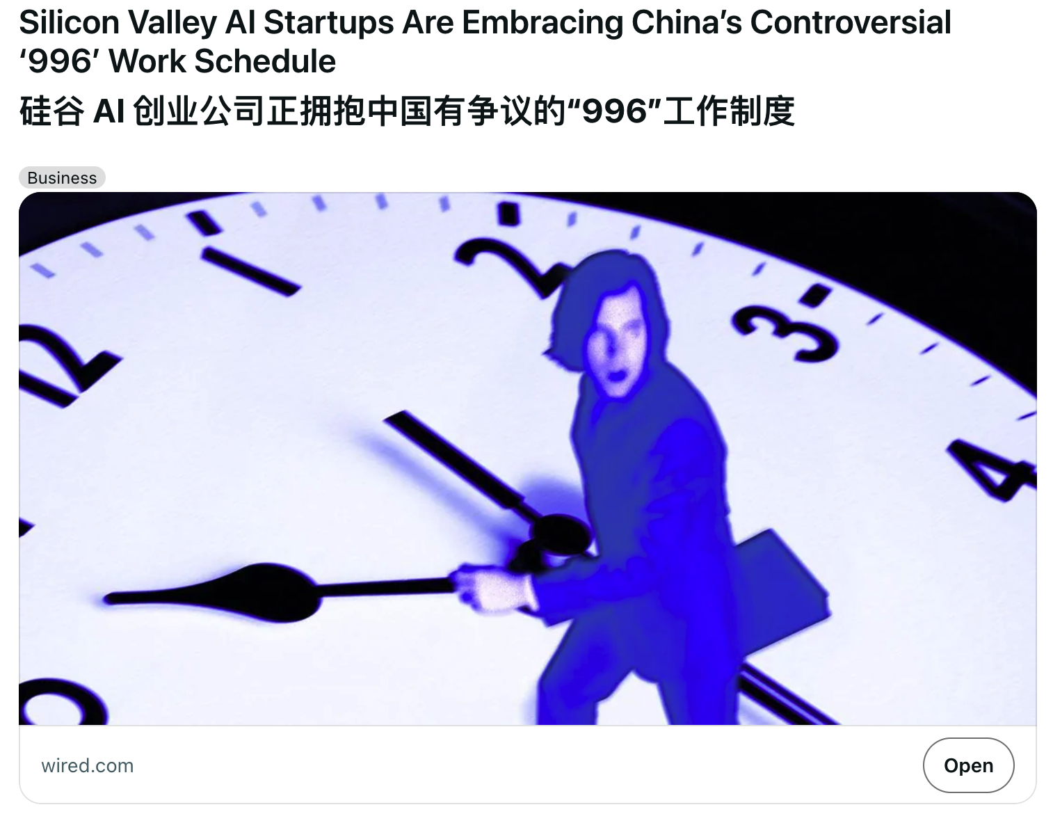 尽管“996”在中国备受争议,美国AI初创公司却将其视为竞争利器,甚至部分投资人将其视为“美德”,优先投资实行该工作节奏的企业 。不过,这种高强度工作文化也引发担忧,如法律风险和对员工健康的潜在影响。