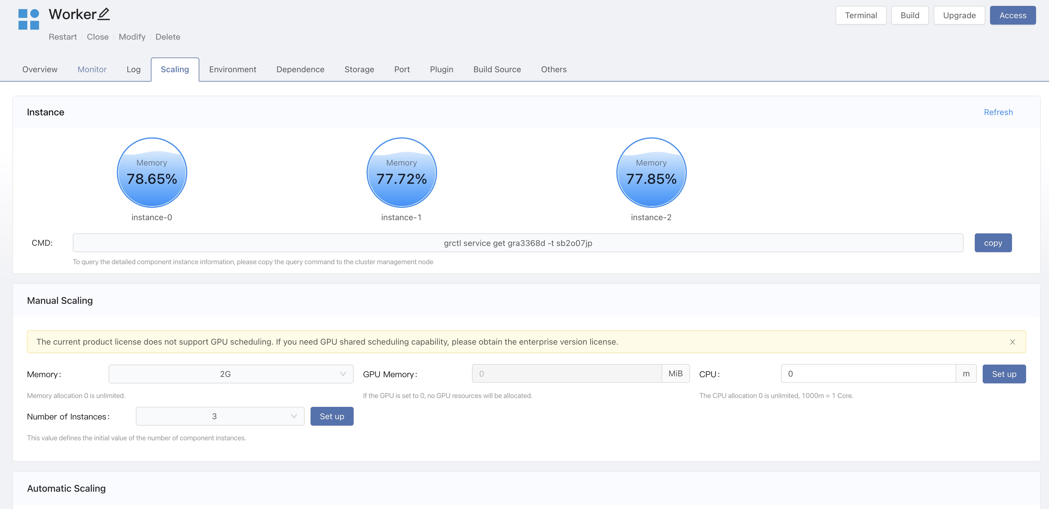 以 Worker 为例,进入组件内 -> 伸缩,设置实例数量。